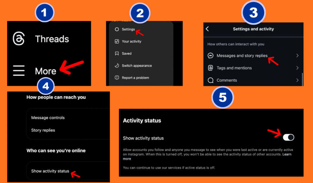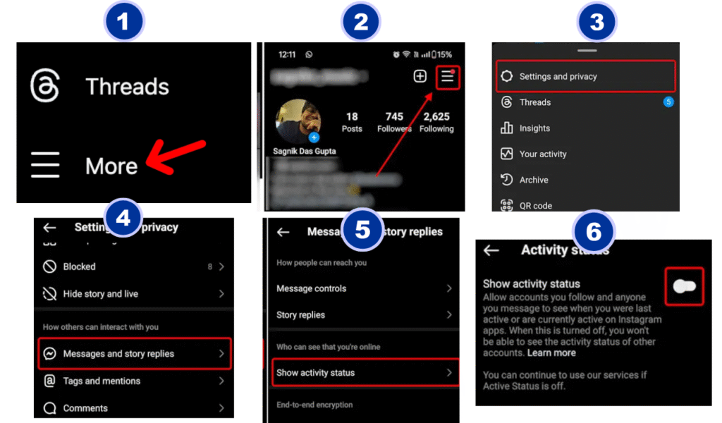 If you want to appear offline while chatting on Instagram, it’s easy to do. Open your Instagram app, go to your profile, and tap the three lines (☰) in the top-right corner. Select Settings and Privacy → Messages and Story Replies → Show Activity Status. Turn off the toggle to hide your online and last active status. Once disabled, your friends won’t see when you’re active or typing in chat, giving you complete privacy while messaging.